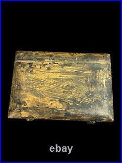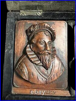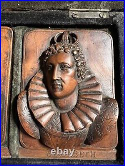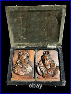 The box showcases fine craftsmanship and historical significance as a unique collectible item from the late 1700s. Total size: 20 x 13 cm. Size portraits: 10 x 8 cm. The portraits represent Robert Dudley and Elizabeth I of England. They lived in the early untill the late 16th century.