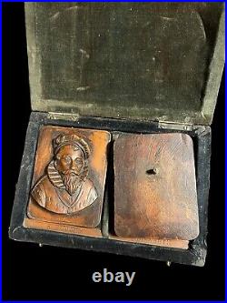 An antique box originating from the United Kingdom in the late 18th century. It is an original piece made of wood, featuring two intricately carved portraits in boxwood.