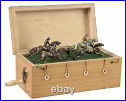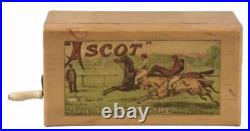 Antique Vintage "Ascot" English Horse Racing Game. By John Jaques and Son. Extend the horses on the string, turn crank and the first to reach the box wins.