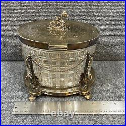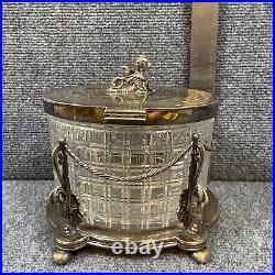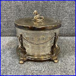 Antique Vintage Crystal Cut Glass Silver Plated Biscuit Box English Winged Sea Horse/Dragon. We could not find any makers marks or stamps. There is a missing Nut on the bottom, see photos. We had the Winges Sea Horse/Dragon Tested at a jewelers and they said it was silver but not sterling, silver plated.