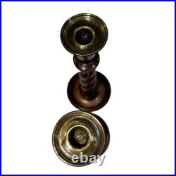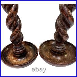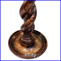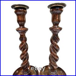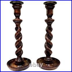 This stately pair of antique/vintage English Barley Twist Tall Wooden Candlesticks measure 11.5" H x 4.5" Diameter Base and brass cups with a wonderful patina! The candlesticks are in very good condition with wear consistent with age and use. A great addition to anyone's home decor or table setting!