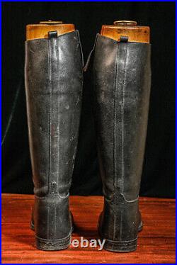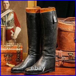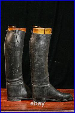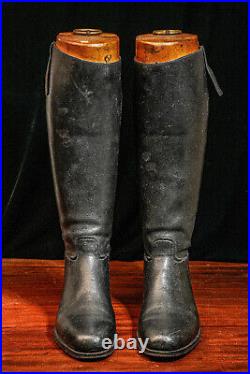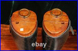 Capture the spirit of a refined past with this exquisite pair of antique black leather horse riding boots, complete with their original wooden form trees. A striking blend of craftsmanship and timeless style, these boots are a nod to the traditions of classic English equestrian life. The leather's rich, aged patina tells a story of journeys through the countryside, evoking visions of stately manors, rolling fields, and the timeless allure of horseback adventures. Their sleek silhouette and impeccable detailing make them not just functional relics, but captivating decor pieces that exude sophistication and history.