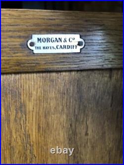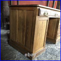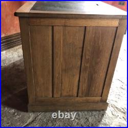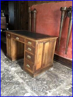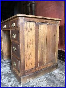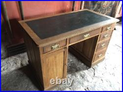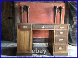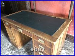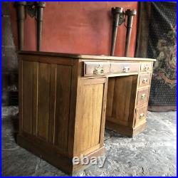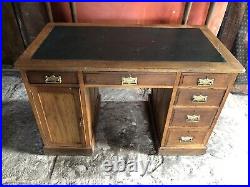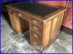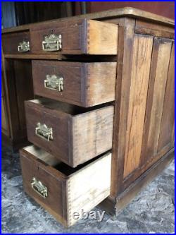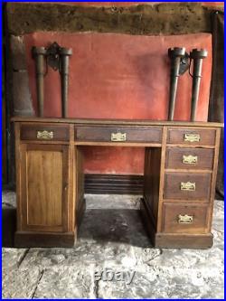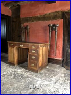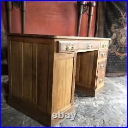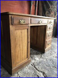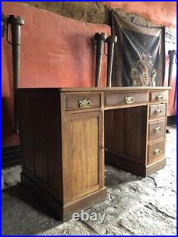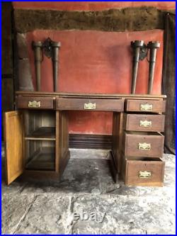 This very solid oak desk is a great size and has a original decorative brassware, with a large cupboard with shelf inside on the left, with six dovetailed drawers along the side and top. Stunning grain and colour on the oak with a lovley aged patina.