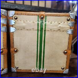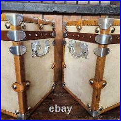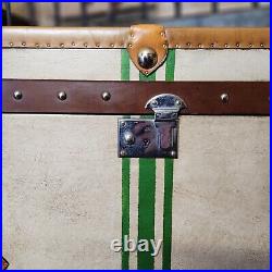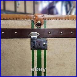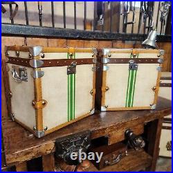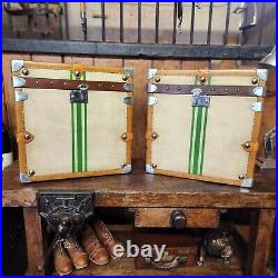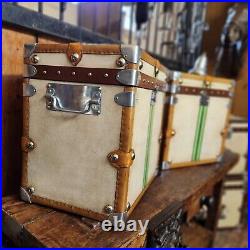 This luxurious reproduction English, pair of vellum leather trunks are meticulously detailed handmade in the UK. They are made with antique vellum leather brass details and antique locks, which would make a stunning addition to any space, combining vintage with the practicality of a modern pieces of furniture. Measuring 50cm in length, 50cm in height, and 36cm in width, this trunk offers ample storage space. It is possible for multiples to be made, with many different finishes, sizes or designs can be adapted. Please ask for more details.