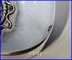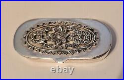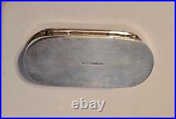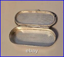 English Sterling Marcasite Pill Snuff Trinket Box. All the marcasite gems are present and it closes securely. Please note there is a miniscule knick on the right side (see last picture).