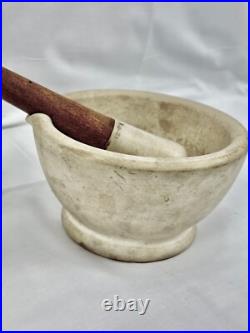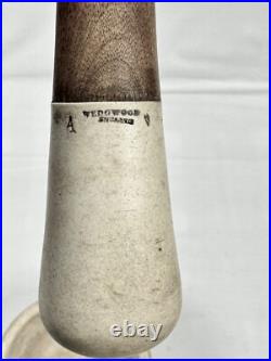This is an Antique Wedge Wood Mortar and Pestle, an original English-made ceramic set from the early 20th century. It is a piece of apothecary and cookery equipment, crafted by the renowned maker Wedge Wood in the United Kingdom.